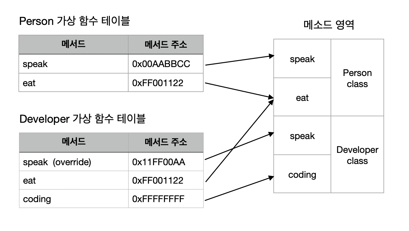 가상 함수 테이블에 주소 값이 저장되어 있기 때문에 다형성을 구현하여 오버라이딩을 했을 때 자동으로 생성된 객체의 메소드가 호출이 된다.